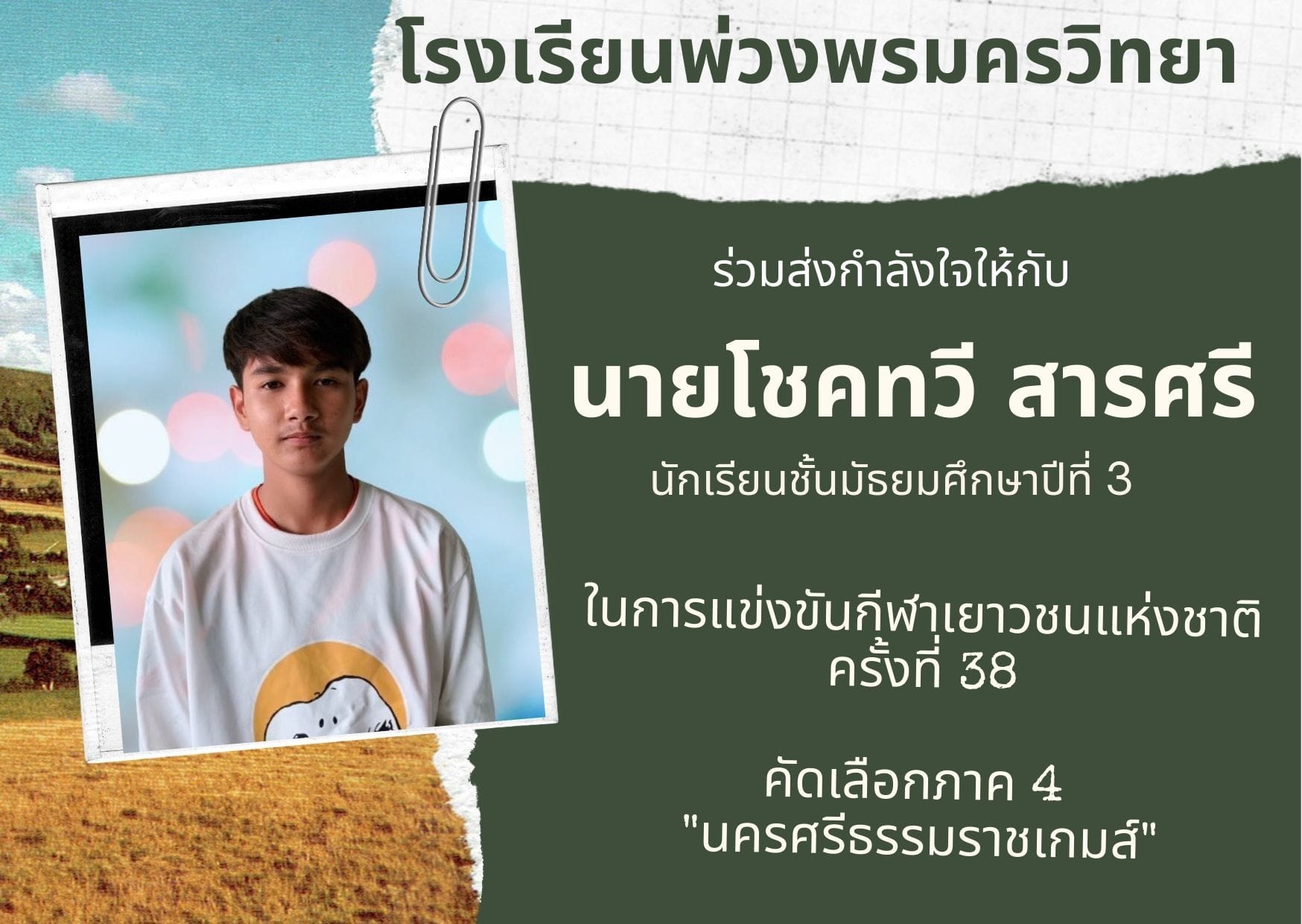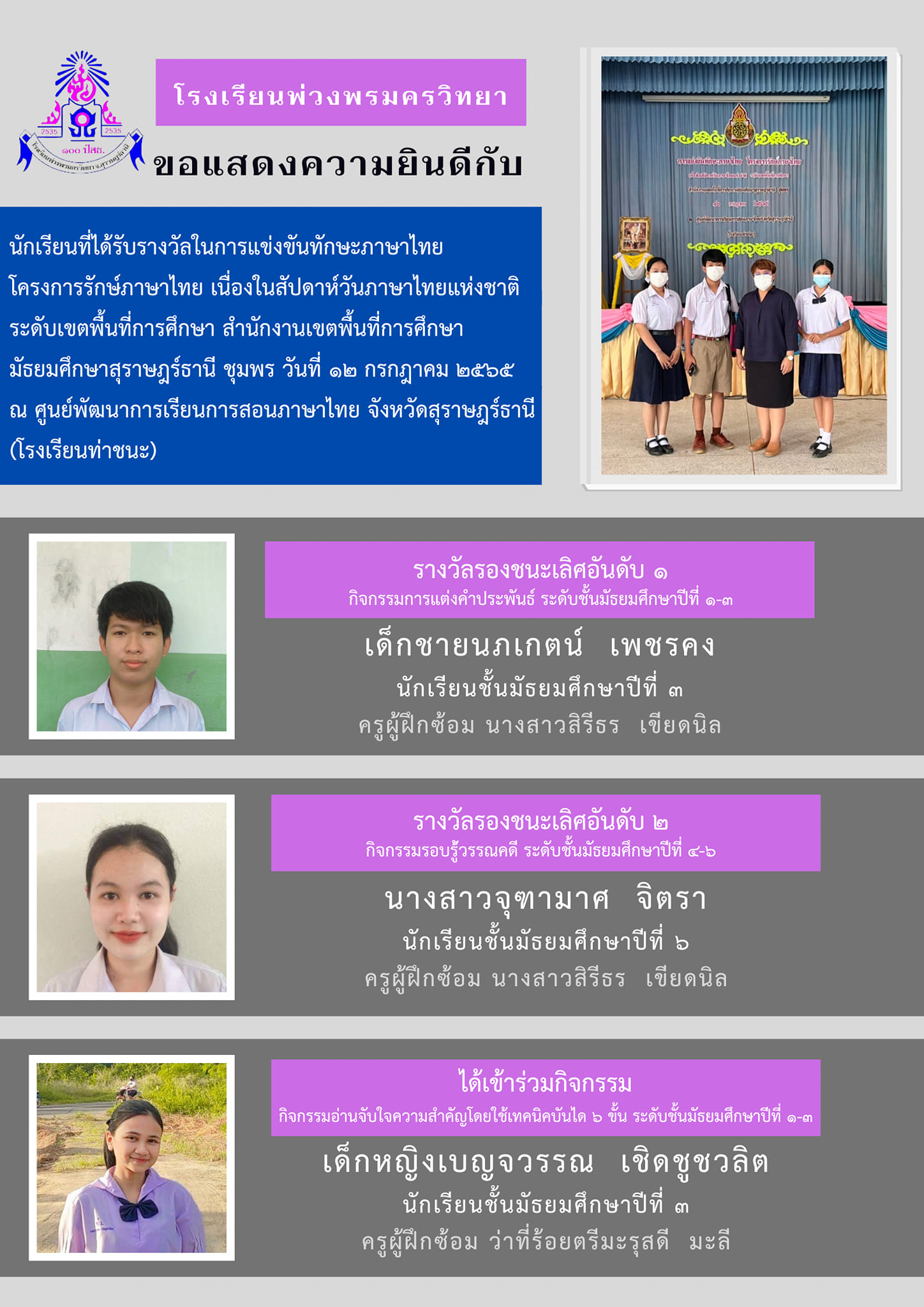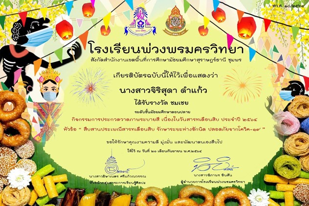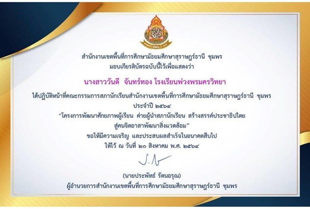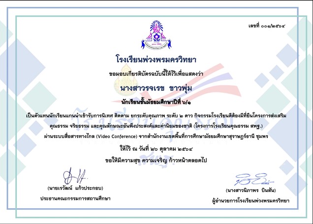 ชื่อผลงาน : เป็นตัวแทนนักเรียนแกนนำเข้ารับการนิเทศติดตามยกระดับคุณภาพระดับ 2 ดาวกิจกรรมโรงเรียนดีต้องมีที่ยืนโครงการส่งเสริมคุณธรรมจริยธรรมและคุณลักษณะอันพึงประสงค์และค่านิยมของชาติผ่านระบบสื่อสารทางไกลจากสำนักงานเขตพื้นที่การศึกษามัธยมศึกษาสุราษฎร์ธานีชุมพร