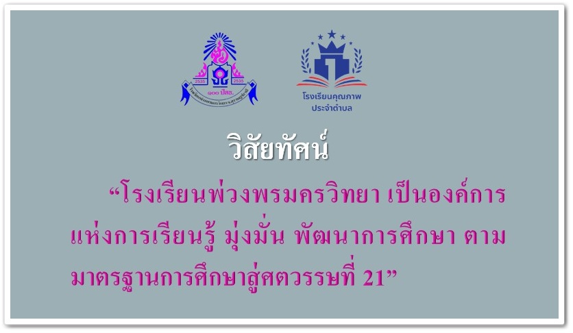 “โรงเรียนพ่วงพรมครวิทยา เป็นองค์การแห่งการเรียนรู้ มุ่งมั่น พัฒนาการศึกษา ตามมาตรฐานการศึกษาสู่ศตวรรษที่ 21”