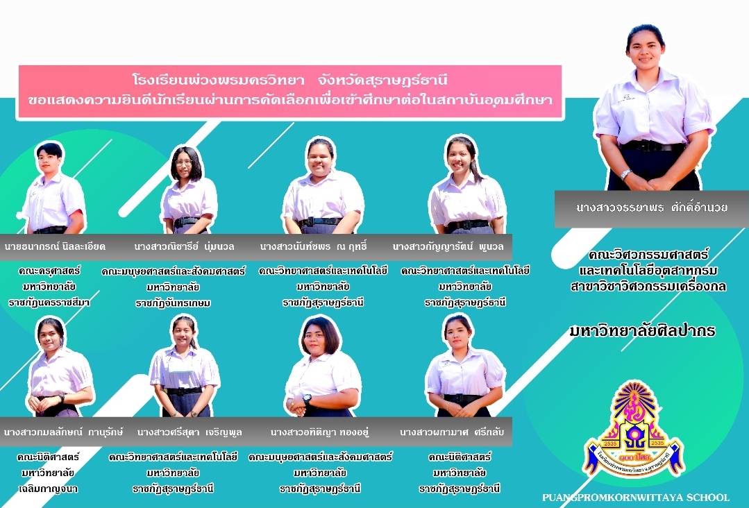 โรงเรียนพ่วงพรมครวิทยา ขอแสดงความยินดีกับนักเรียนระดับชั้นมัธยมศึกษาปีที่ 6 ที่ผ่านการคัดเลือกเข้าศึกษาในระดับอุดมศึกษา ในประเภทต่าง ๆ ประจำปีการศึกษา 2563
