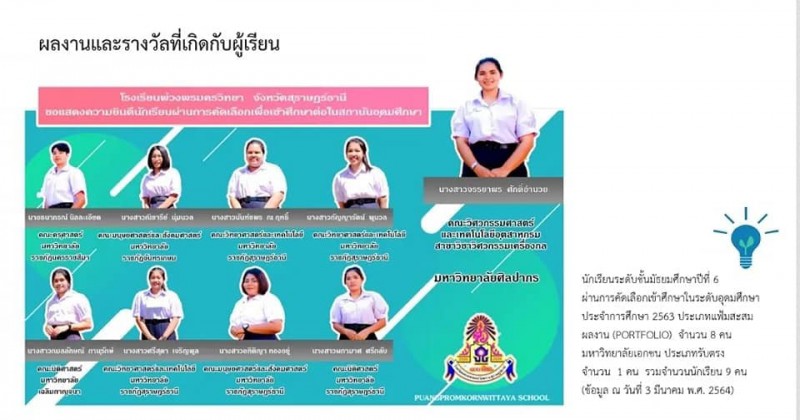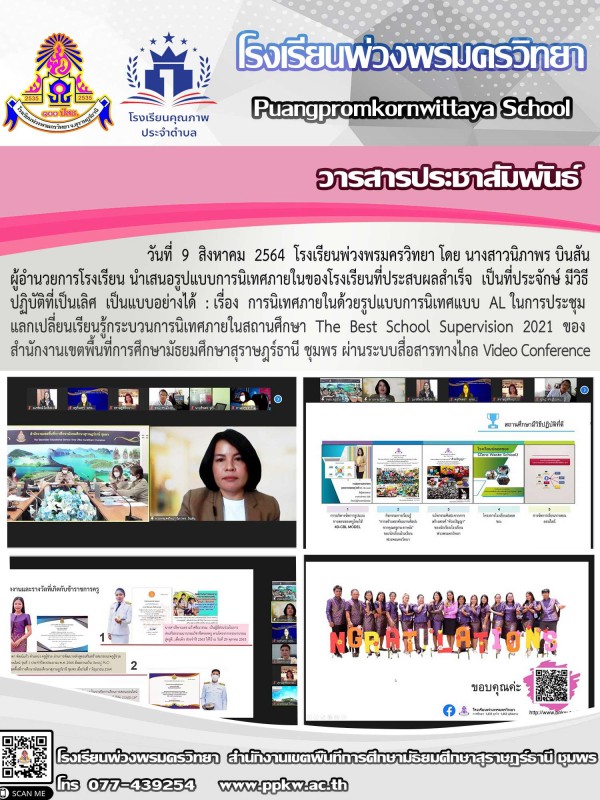 วันที่ 9 สิงหาคม 2564 โรงเรียนพ่วงพรมครวิทยา โดย นางสาวนิภาพร บินสัน ผู้อำนวยการโรงเรียน นำเสนอรูปแบบการนิเทศภายในของโรงเรียนที่ประสบผลสำเร็จ เป็นที่ประจักษ์ มีวิธีปฏิบัติที่เป็นเลิศ เป็นแบบอย่างได้ : เรื่อง การนิเทศภายในด้วยรูปแบบการนิเทศแบบ AL ในการประชุมแลกเปลี่ยนเรียนรู้กระบวนการนิเทศภายในสถานศึกษา The Best School Supervision 2021 ของสำนักงานเขตพื้นที่การศึกษามัธยมศึกษาสุราษฎร์ธานี ชุมพร ผ่านระบบสื่อสารทางไกล Video Conference โดยมีโรงเรียนร่วมนำเสนอทั้งสิ้น 5 โรงเรียน ได้แก่
