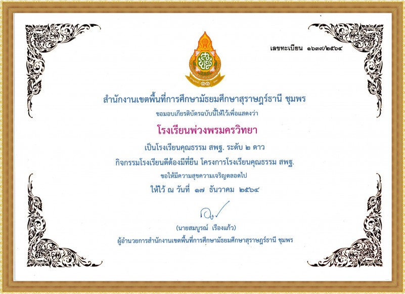 โรงเรียนพ่วงพรมครวิทยาได้รับเกียรติบัตร เป็นโรงเรียนคุณธรรม สพฐ. ระดับ ๒ ดาว กิจกรรมโรงเรียนดีต้องมีที่ยืน โครงการโรงเรียนคุณธรรม สพฐ.จากสำนักงานเขตพื้นที่การศึกษามัธยมศึกษาสุราษฎร์ธานี ชุมพร โครงการโรงเรียนคุณธรรม สพฐ. ตามนโยบายสำนักงานคณะกรรมการการศึกษาขั้นพื้นฐานในการดำเนินการขับเคลื่อนโครงการโรงเรียนคุณธรรม สพฐ. ซึ่งมีเป้าหมายยกระดับคุณธรรมจริยธรรมต่อยอดให้ผู้เรียน ครู ผู้บริหารและบุคลากรทางการศึกษาในโรงเรียนให้มีจิตสำนึกที่ดี ปฏิบัติตนบนพื้นฐานคุณธรรม จริยธรรมที่ดีงาม