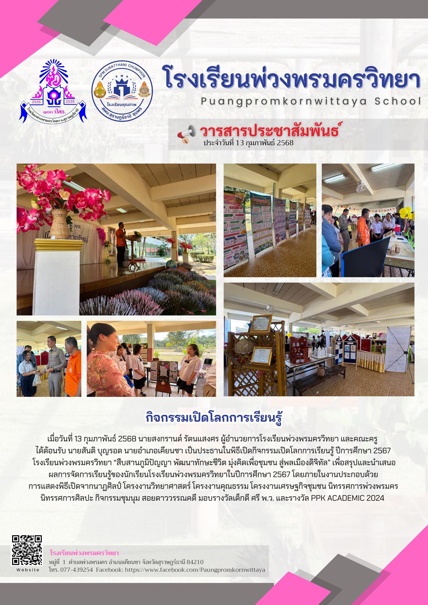 เมื่อวันที่ 13 กุมภาพันธ์ 2568 นายสงกรานต์ รัตนแสงศร ผู้อำนวยการโรงเรียนพ่วงพรมครวิทยา และคณะครู ได้ต้อนรับ นายสันติ บุญรอด นายอำเภอเคียนซา เป็นประธานในพิธีเปิดกิจกรรมเปิดโลกการเรียนรู้ ปีการศึกษา 2567โรงเรียนพ่วงพรมครวิทยา “สืบสานภูมิปัญญา พัฒนาทักษะชีวิต มุ่งคิดเพื่อชุมชน สู่พลเมืองดิจิทัล” เพื่อสรุปและนำเสนอผลการจัดการเรียนรู้ของนักเรียนโรงเรียนพ่วงพรมครวิทยาในปีการศึกษา 2567 โดยภายในงานประกอบด้วยการแสดงพิธีเปิดจากนาฏศิลป์ โครงงานวิทยาศาสตร์ โครงงานคุณธรรม โครงงานเศรษฐกิจชุมชน นิทรรศการพ่วงพรมคร นิทรรศการศิลปะ กิจกรรมชุมนุม สอยดาววรรณคดี มอบรางวัลเด็กดี ศรี พ.ว. และรางวัล PPK ACADEMIC 2024