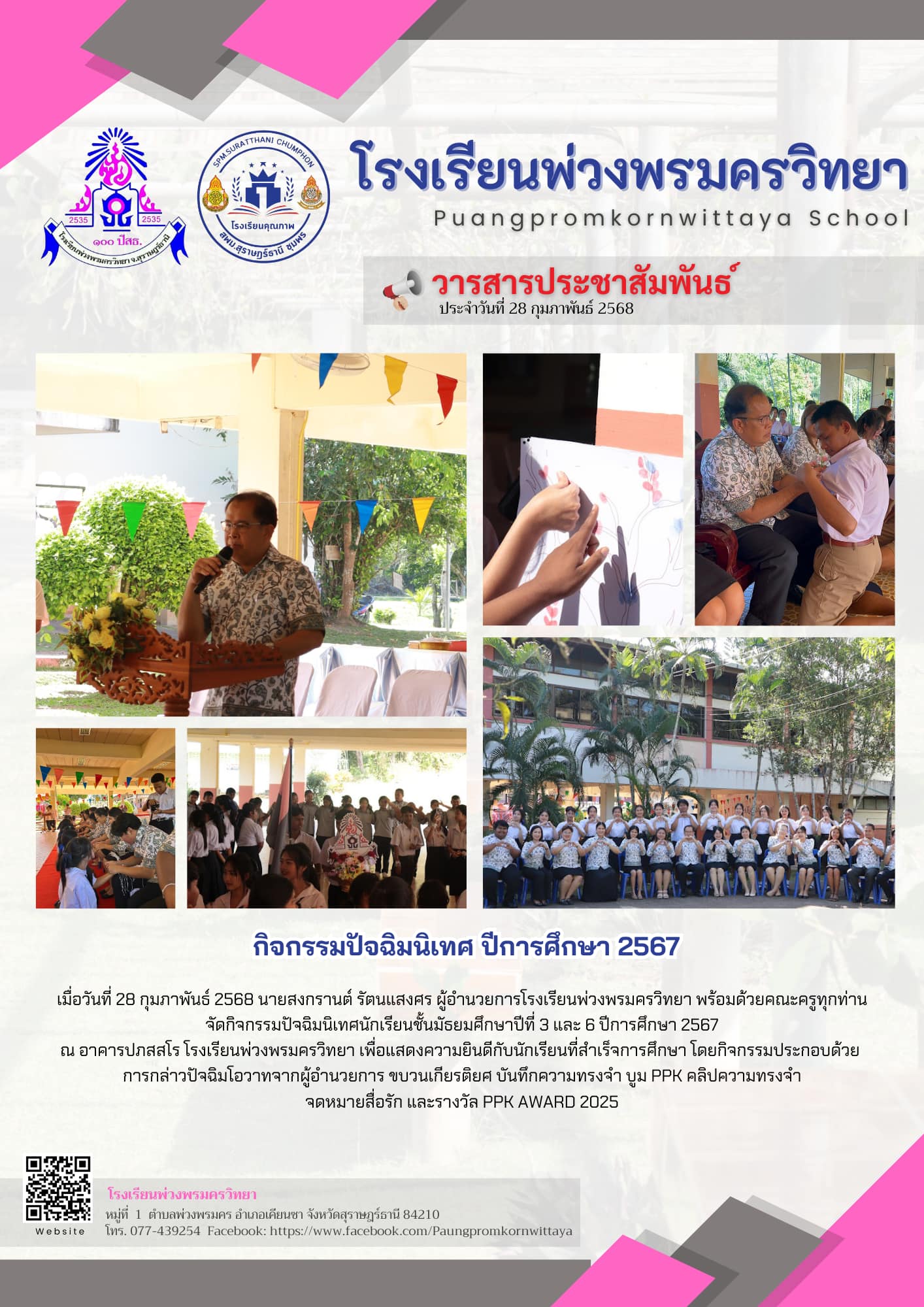 | เมื่อวันที่ 28 กุมภาพันธ์ 2568 นายสงกรานต์ รัตนแสงศร ผู้อำนวยการโรงเรียนพ่วงพรมครวิทยา พร้อมด้วยคณะครูทุกท่านจัดกิจกรรมปัจฉิมนิเทศนักเรียนชั้นมัธยมศึกษาปีที่ 3 และ 6 ปีการศึกษา 2567 ณ อาคารปภสสโร โรงเรียนพ่วงพรมครวิทยา เพื่อแสดงความยินดีกับนักเรียนที่สำเร็จการศึกษา โดยกิจกรรมประกอบด้วย การกล่าวปัจฉิมโอวาทจากผู้อำนวยการ ขบวนเกียรติยศ บันทึกความทรงจำ บูม PPK คลิปความทรงจำ จดหมายสื่อรัก และรางวัล PPK AWARD 2025 |