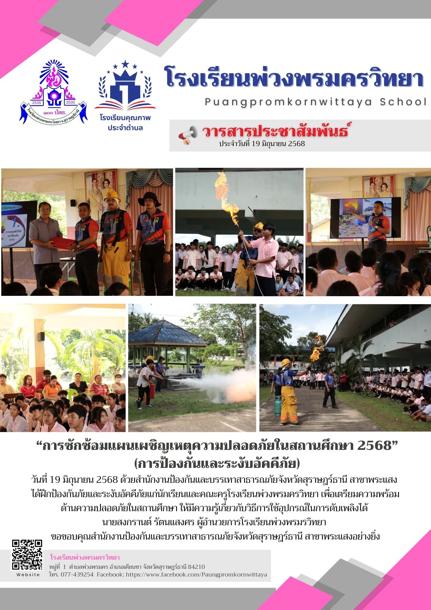 วันที่ 19 มิถุนายน 2568 ด้วยสำนักงานป้องกันและเบาเทาสาธารณภัยจังหวัดสุราษฎร์ธานี สาขาพระแสง ได้ฝึกป้องกันภัยและระงับอัคคีภัยแก่นักเรียนและคณะครูโรงเรียนพ่วงพรมครวิทยา เพื่อเตรียมความพร้อมด้านความปลอดภัยในสถานศึกษา ทางโรงเรียนพ่วงพรมครวิทยาขอขอบคุณเป็นอย่างยิ่ง