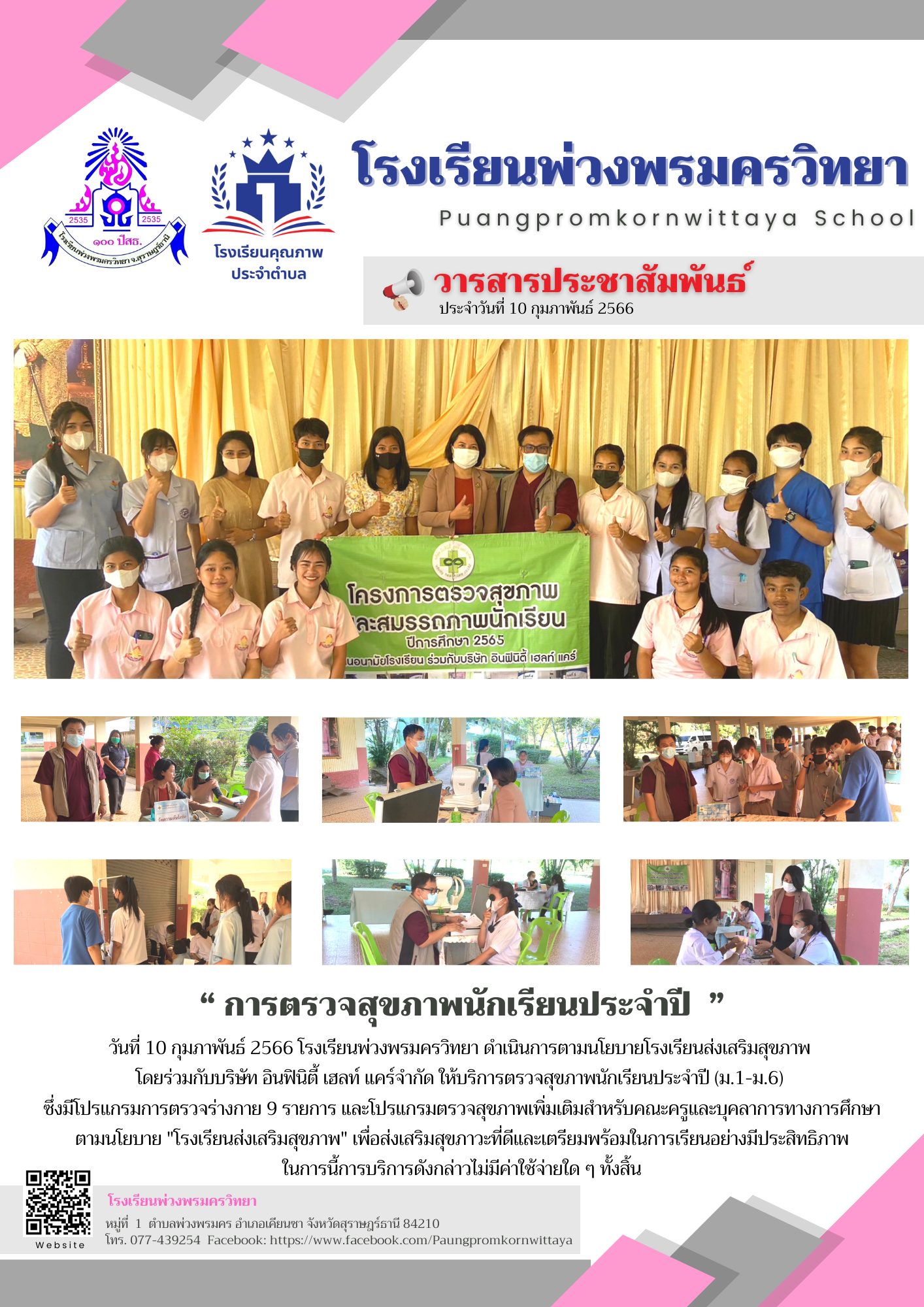 โรงเรียนพ่วงพรมครวิทยา ดำเนินการตามนโยบายโรงเรียนส่งเสริมสุขภาพ โดยร่วมกับบริษัท อินฟินิตี้ เฮลท์ แคร์จำกัด ให้บริการตรวจสุขภาพนักเรียนประจำปี (ม.1-ม.6) ซึ่งมีโปรแกรมการตรวจร่างกาย 9 รายการ และโปรแกรมตรวจสุขภาพเพิ่มเติมสำหรับคณะครูและบุคลาการทางการศึกษา ต