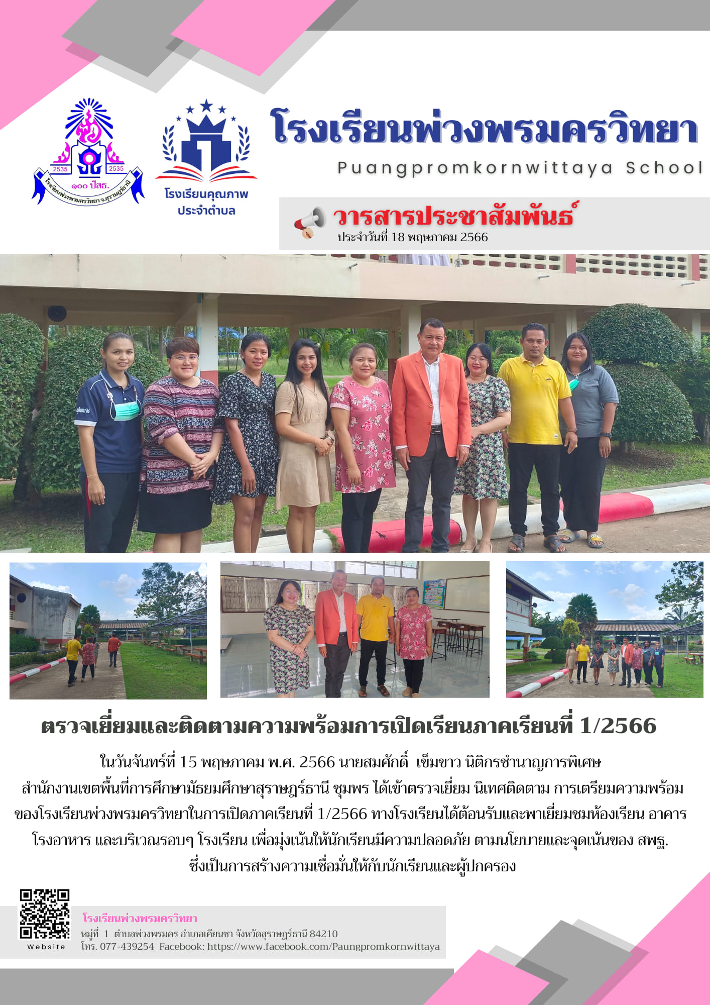 สำนักงานเขตพื้นที่การศึกษามัธยมศึกษาสุราษฎร์ธานี ชุมพร ได้เข้าตรวจเยี่ยม นิเทศติดตามการเตรียมความพร้อมของโรงเรียนพ่วงพรมครวิทยาในการเปิดภาคเรียนที่ 1/2566