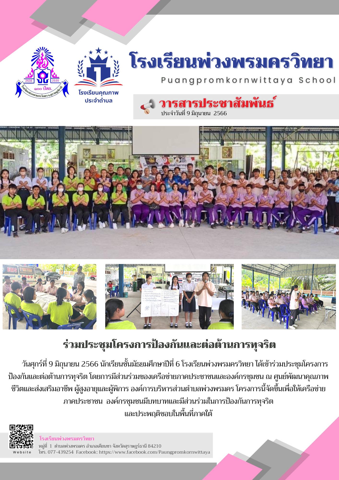 ร่วมประชุมโครงการป้องกันและต่อต้านการทุจริต โดยการ มีส่วนร่วมของเครือข่ายภาคประชาชนและองค์กรชุมชน ณ ศูนย์พัฒนาคุณภาพชีวิตและส่งเสริมอาชีพ ผู้สูงอายุและผู้พิการ องค์การบริหารส่วนตำบลพ่วงพรมคร