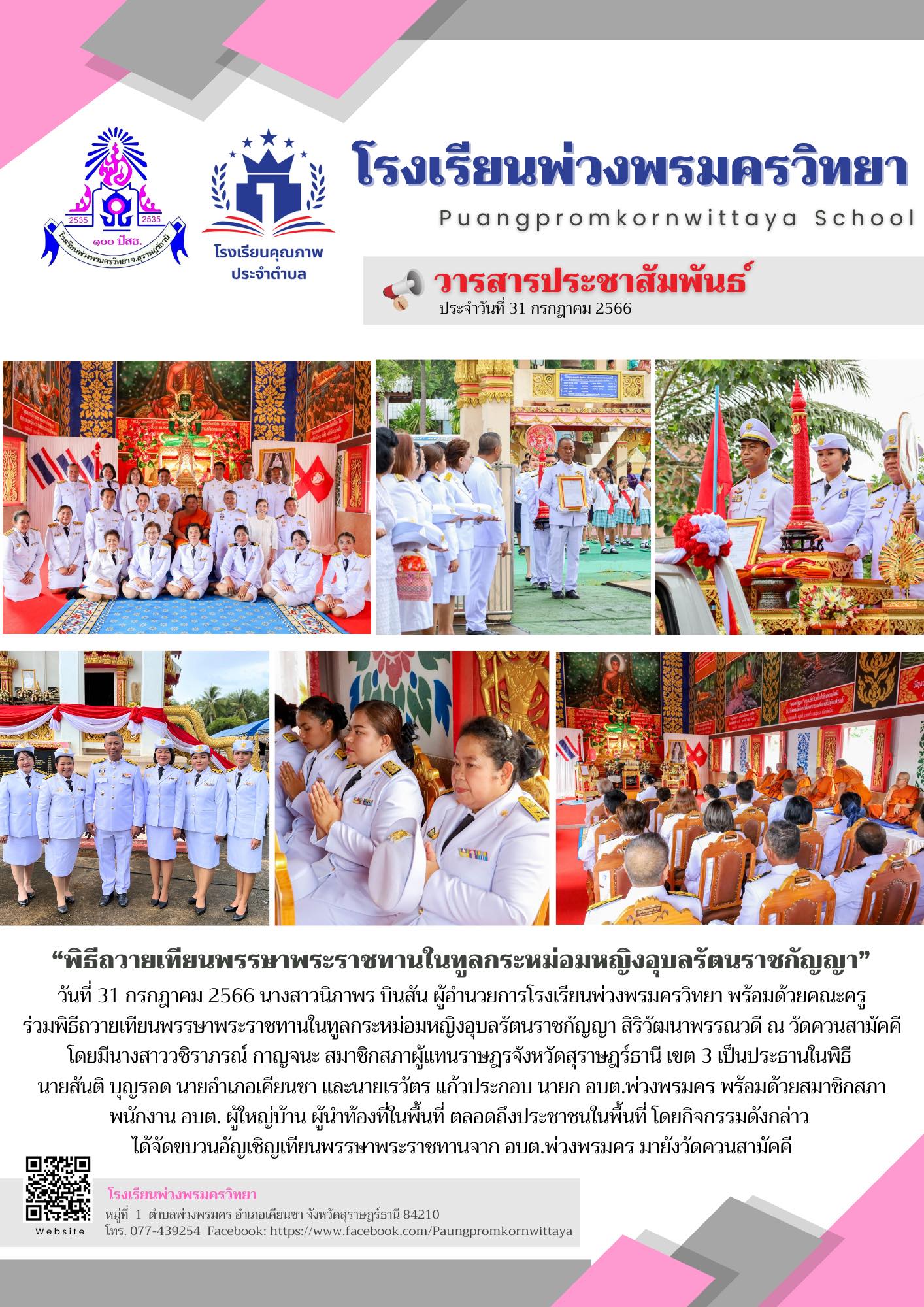 ผู้อำนวยการโรงเรียนพ่วงพรมครวิทยา พร้อมด้วยคณะครู ร่วมพิธีถวายเทียนพรรษาพระราชทานในทูลกระหม่อมหญิงอุบลรัตนราชกัญญา สิริวัฒนาพรรณวดี ณ วัดควนสามัคคี