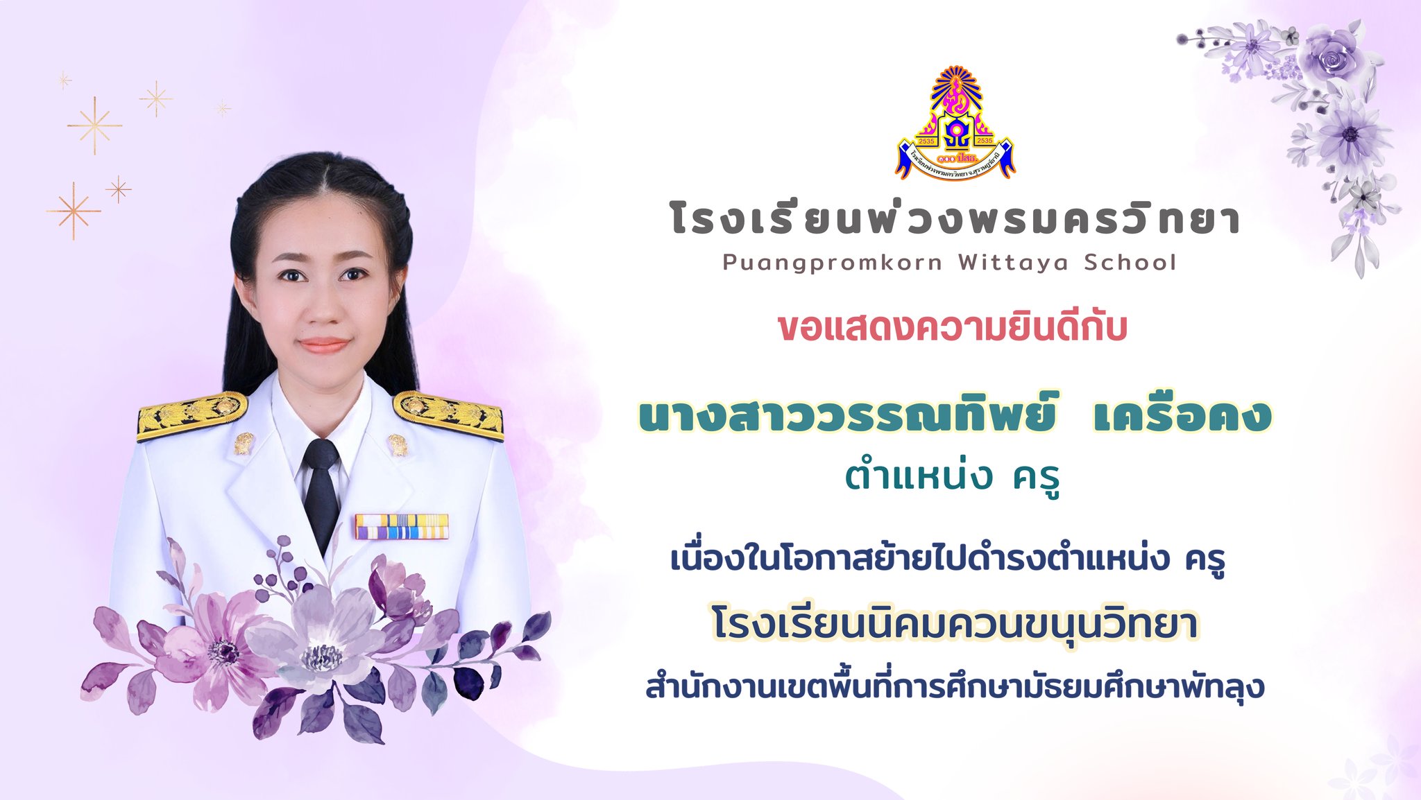โรงเรียนพ่วงพรมครวิทยา ขอแสดงความยินดีกับ นางสาววรรณทิพย์ เครือคง ตำแหน่ง ครู วิทยฐานะ ครูชำนาญการ เนื่องในโอกาสย้ายไปดำรงตำแหน่ง ครู โรงเรียนนิคมควนขนุนวิทยา สำนักงานเขตพื้นที่การศึกษามัธยมศึกษาพัทลุง