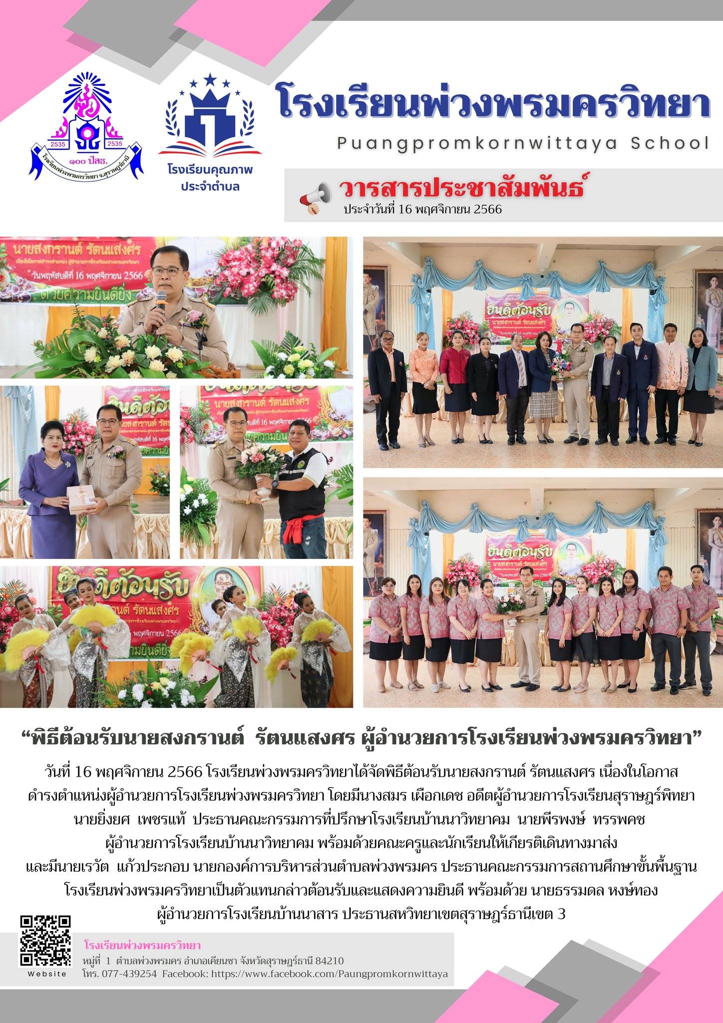 วันที่ 16 พฤศจิกายน 2566 โรงเรียนพ่วงพรมครวิทยาได้จัดพิธีต้อนรับ