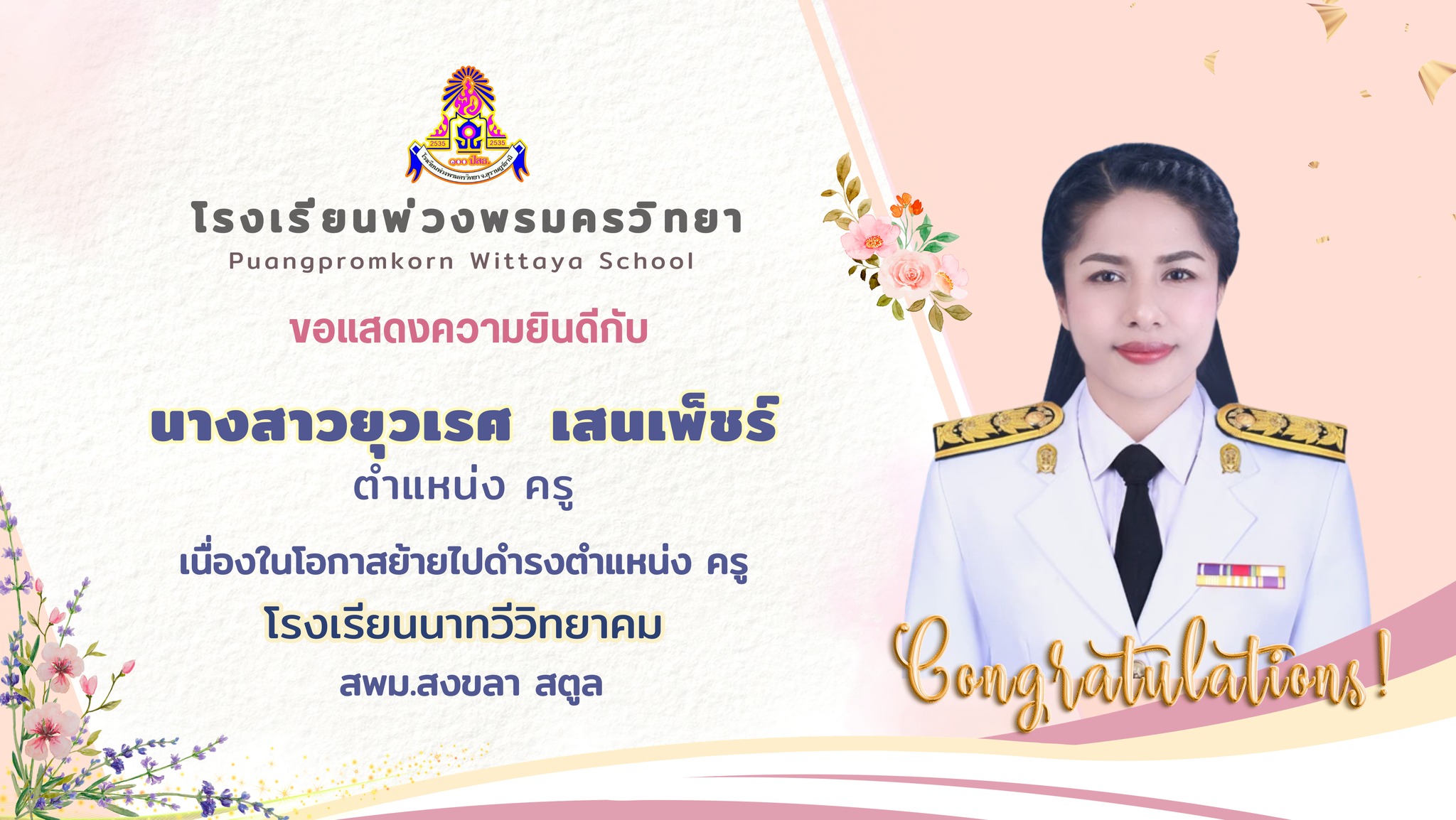 โรงเรียนพ่วงพรมครวิทยา ขอแสดงความยินดีกับ นางสาวยุวเรศ เสนเพ็ชร์ ตำแหน่ง ครู เนื่องในโอกาสย้ายไปดำรงตำแหน่ง ครู โรงเรียนนาทวีวิทยาคม สำนักงานเขตพื้นที่การศึกษามัธยมศึกษาสงขลา สตูล