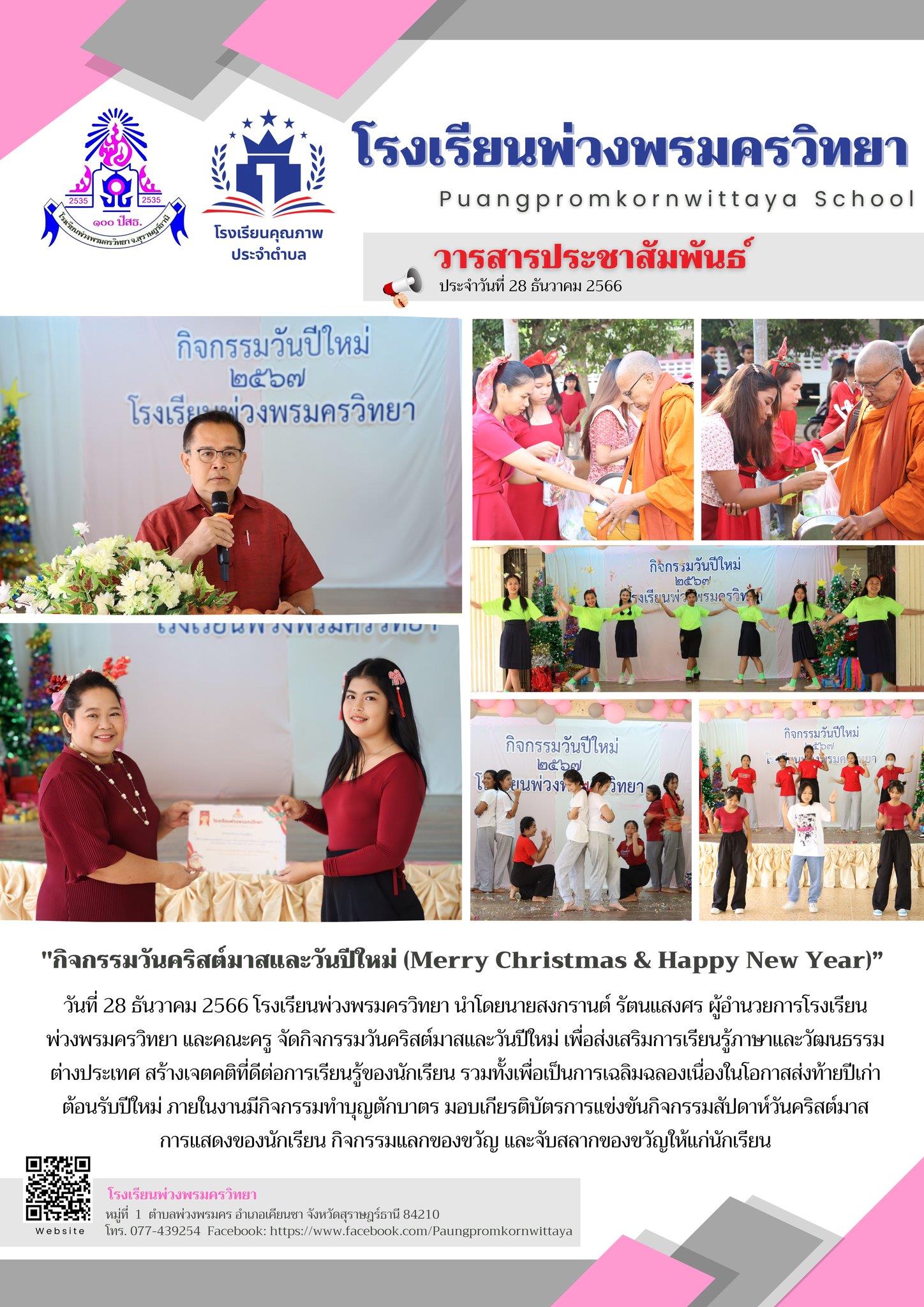 วันที่ 28 ธันวาคม 2566 โรงเรียนพ่วงพรมครวิทยา นำโดยนายสงกรานต์ รัตนแสงศร ผู้อำนวยการโรงเรียนพ่วงพรมครวิทยา และคณะครู จัดกิจกรรมวันคริสต์มาสและวันปีใหม่ เพื่อส่งเสริมการเรียนรู้ภาษาและวัฒนธรรมต่างประเทศ สร้างเจตคติที่ดีต่อการเรียนรู้ของนักเรียน