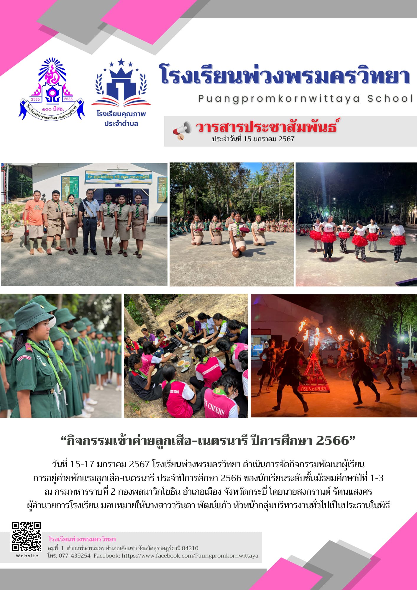 โรงเรียนพ่วงพรมครวิทยา ได้จัดกิจกรรมเข้าค่ายลูกเสือ-เนตรนารี ปีการศึกษา 2566 ในวันที่ 15-17มกราคม 2567 ณ กรมทหารราบที่ 2 กองพลนาวิกโยธิน จังหวัดกระบี่