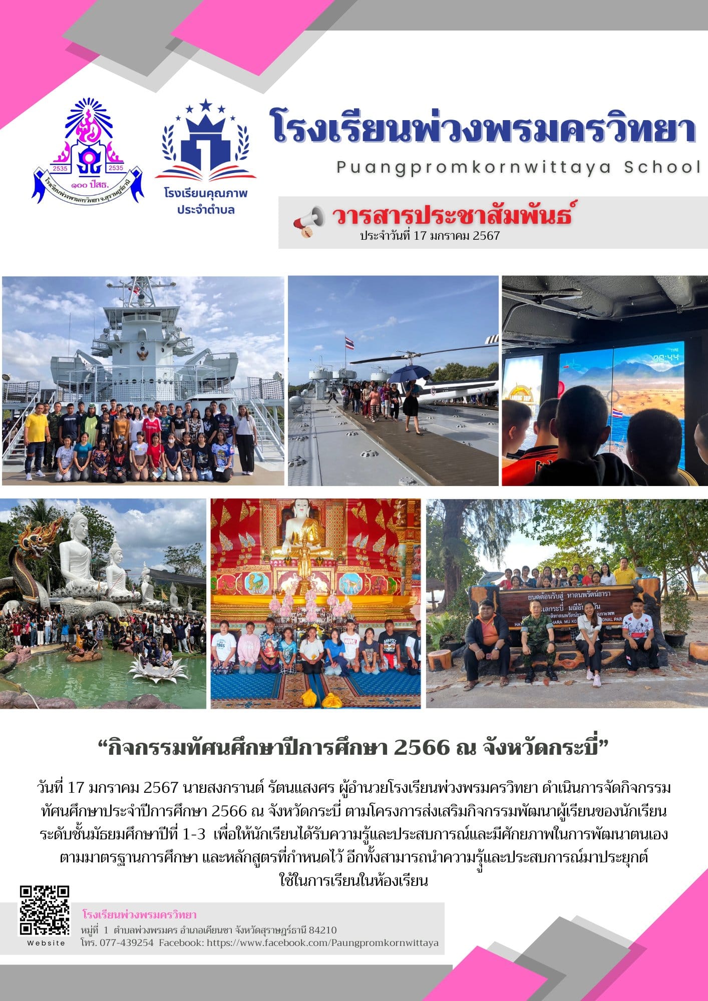 วันที่ 17 มกราคม 2567 โรงเรียนพ่วงพรมครวิทยา นำโดยนายสงกรานต์ รัตนแสงศร ผู้อำนวยการโรงเรียนพ่วงพรมครวิทยา และคณะครู จัดกิจกรรมทัศนศึกษาระดับมัธยมศึกษาปีที่ 1-3 ณ จังหวัดกระบี่ เพื่อให้นักเรียนได้รับความรู้และประสบการณ์และมีศักยภาพในการพัฒนาตนเอง ตามมาตรฐา