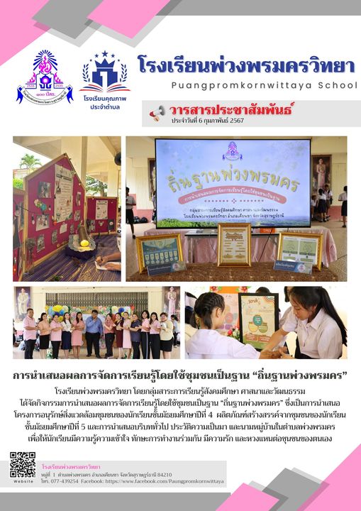 | วันที่ 6 กุมภาพันธ์ 2567 กลุ่มสาระสังคมศึกษา ศาสนาและวัฒนธรรม ได้จัดกิจกรรมการนำเสนอผลการจัดการเรียนรู้โดยใช้ชุมชนเป็นฐาน “ถิ่นฐานพ่วงพรมคร” ซึ่งเป็นการนำเสนอโครงการอนุรักษ์สิ่งแวดล้อมชุมชนของนักเรียนชั้นมัธยมศึกษาปีที่ 4 ผลิตภัณฑ์สร้างสรรค์จากชุมชนของนักเรียนชั้นมัธยมศึกษาปีที่ 5 และการนำเสนอบริบททั่วไป ประวัติความเป็นมา และนามหมู่บ้านในตำบลพ่วงพรมคร เพื่อให้นักเรียนมีความรู้ความเข้าใจ ทักษะการทำงานร่วมกัน มีความรัก และหวงแหนต่อชุนชนของตนเอง |