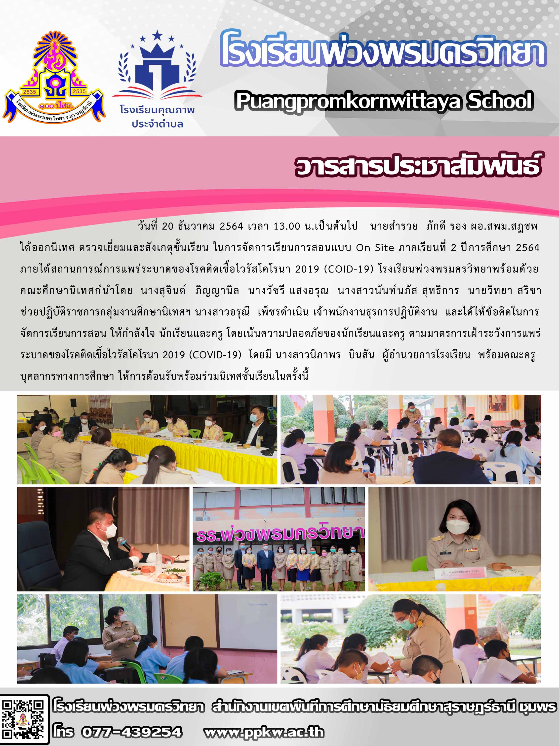 รับการตรวจเยี่ยมและสังเกตุชั้นเรียน ในการจัดการเรียนการสอนแบบ On Site ภาคเรียนที่ 2 ปีการศึกษา 2564 ภายใต้สถานการณ์การแพร่ระบาดของโรคติดเชื้อไวรัสโคโรนา 2019 (COVID-19)โรงเรียนพ่วงพรมครวิทยา