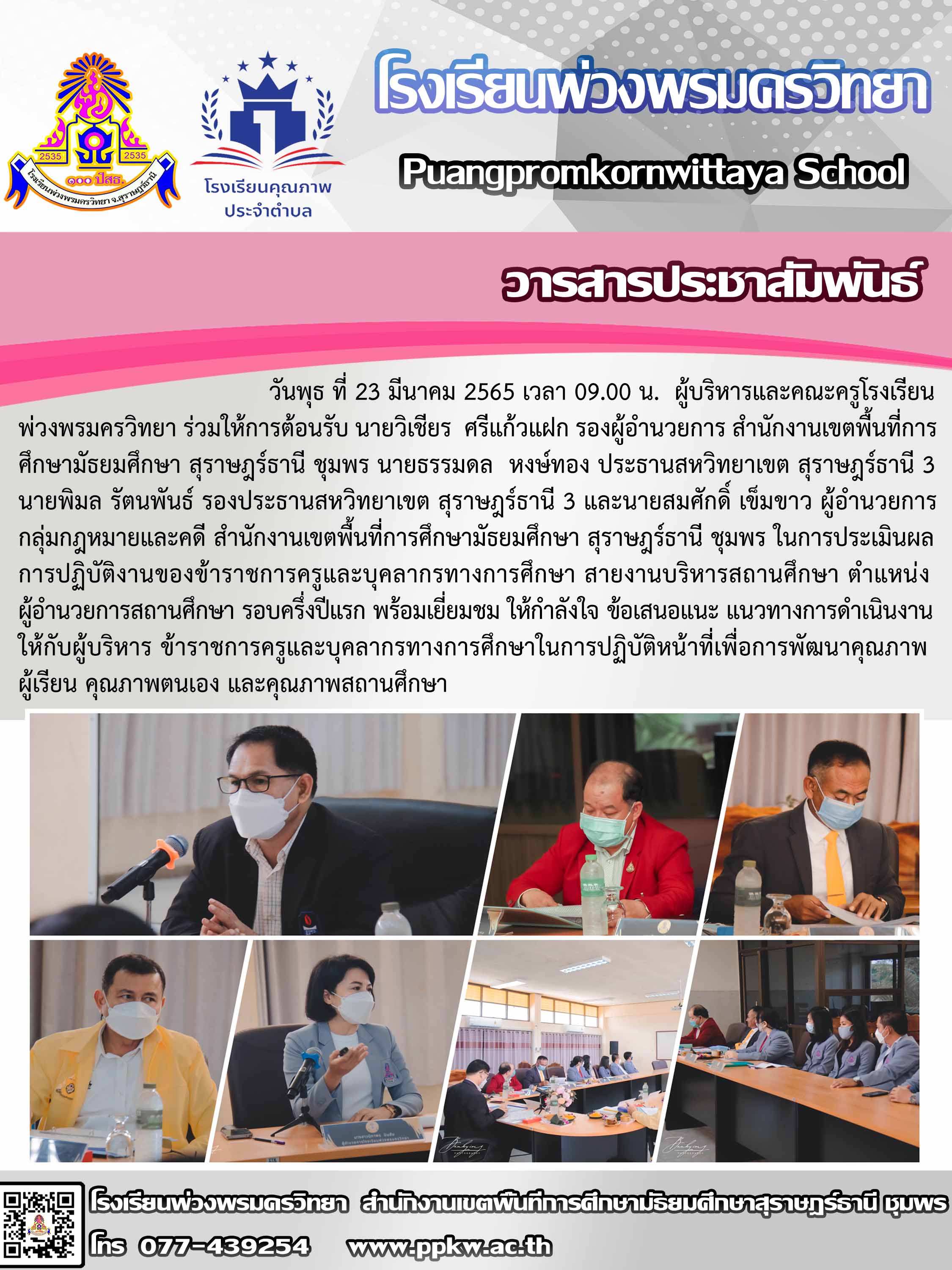 นางสาวนิภาพร บินสัน ผู้อำนวยการโรงเรียนพ่วงพรมครวิทยา รับการประเมินผลการปฏิบัติงานของข้าราชการครูและบุคลากรทางการศึกษา สายงานบริหารสถานศึกษา ตำแหน่งผู้อำนวยการสถานศึกษา รอบครึ่งปีแรก