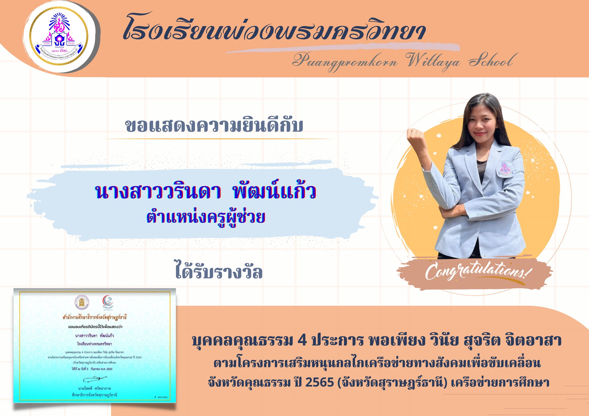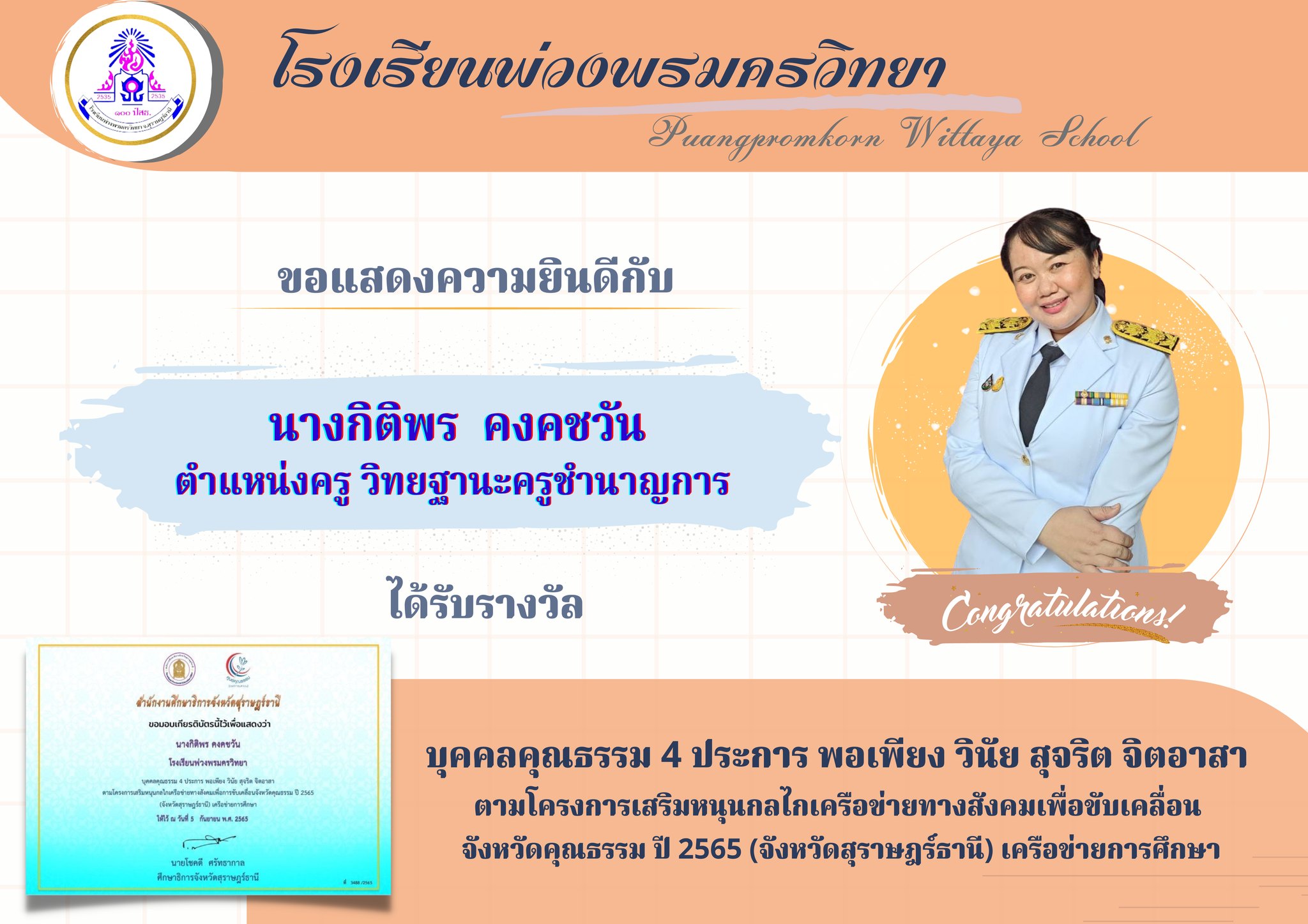 รางวัลยกย่องเชิดชูเกียรติ "10,000 คุรุชน คนคุณธรรม" ประเภทครู ระดับเขตพื้นที่การศึกษา ประจำปีงบประมาณ 2565 สำนักงานเขตพื้นที่การศึกษามัธยมศึกษาสุราษฎร์ธานี ชุมพร |